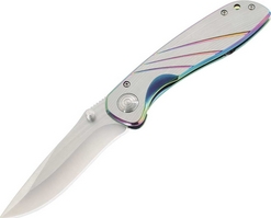 Lame acier 420 à cran intérieur et à bouton, manche acier coloris "arc-en-ciel"