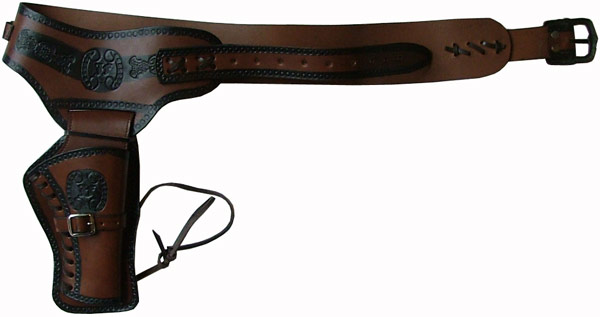 Tout en cuir épais avec gravures et plusieurs pièces de cuir décoratives.