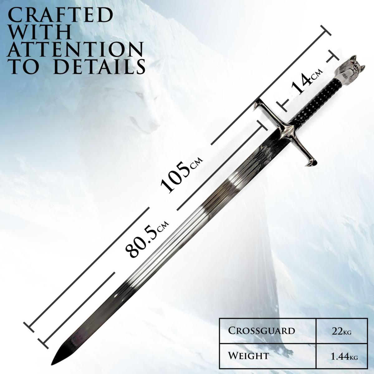 La poignée est fidèlement détaillée et conçue pour reproduire le pommeau direwolf emblématique qui fait de "Longclaw" l’une des armes les plus reconnaissables de Westeros.