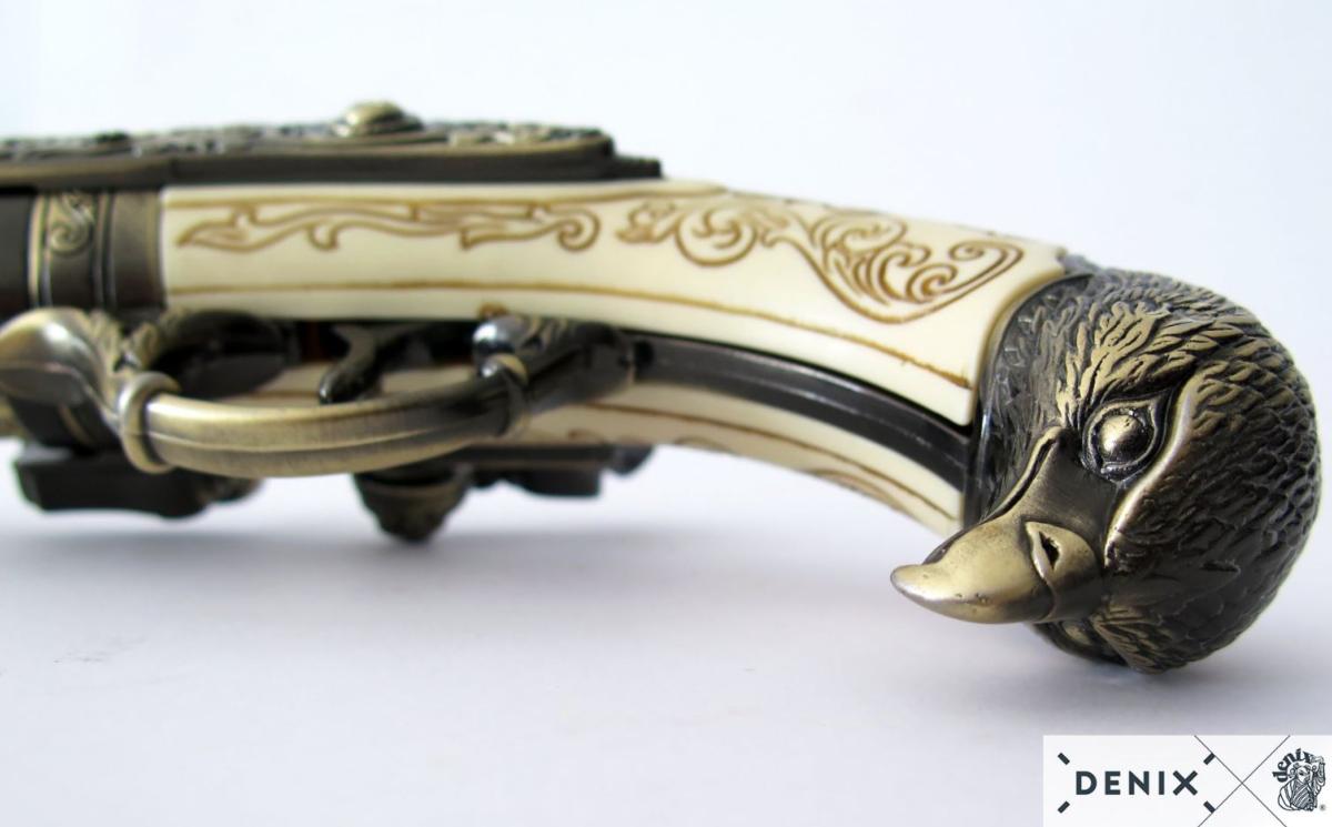Reproduction de pistolet à étincelles à 3 canons avec une tête d'aigle, en métal et avec des imitations de pièces ivoire, avec mécanisme de simulation de chargement et de tir.