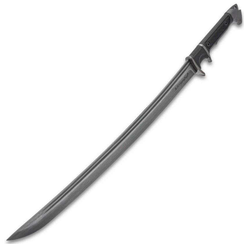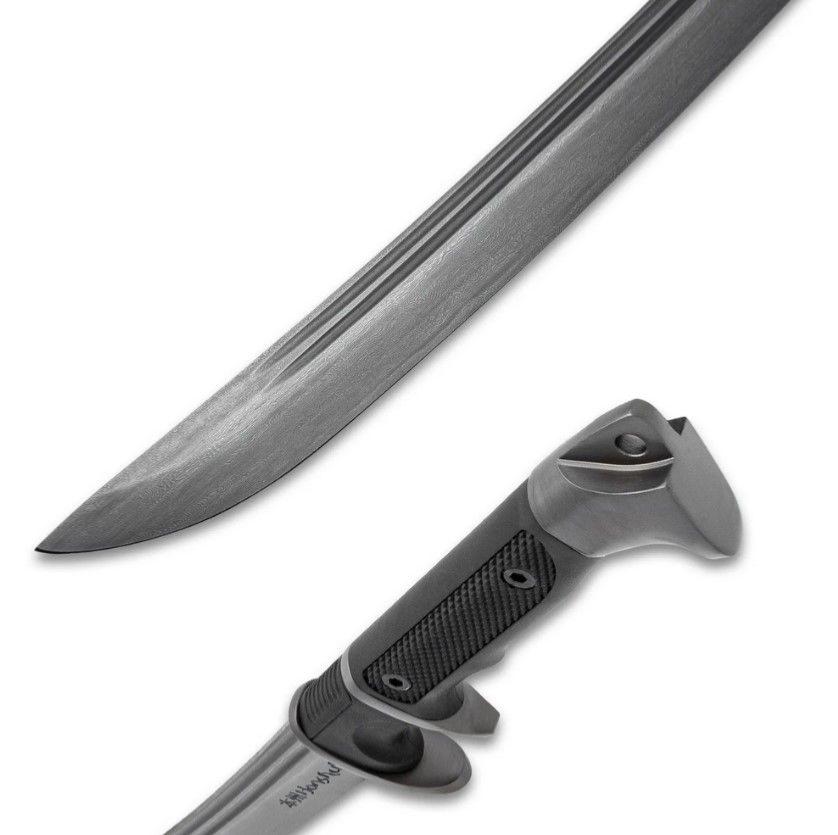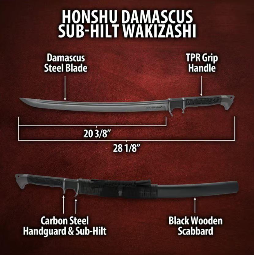 Le Honshu Damascus Sub-Hilt Wakizashi est une fusion puissante de l’artisanat traditionnel et de l’innovation tactique moderne. Sa lame en acier 20 3/8” Damas présente des motifs ondulés complexes, offrant à la fois une esthétique frappante et une durabilité supérieure. Renforcé par un protège-main en acier au carbone et une garde, ce wakizashi offre un contrôle et une précision accrus, assurant une prise ferme en toute situation. La poignée TPR texturée et crantée améliore encore la stabilité, ce qui en fait un choix fiable pour les collectionneurs et ceux qui recherchent un avantage tactique. Mesurant 28 1/8” dans l’ensemble, ce wakizashi sous-manche est logé dans un fourreau en bois noir semi-brillant avec un emballage en similicuir, offrant à la fois une protection et un affichage élégant. Le pommeau en acier au carbone comprend un trou de longe pour des options de transport supplémentaires, ce qui le rend polyvalent pour diverses applications. Qu’il soit exposé dans le cadre d’une collection ou transporté pour un usage pratique, le Honshu Damascus Sub-Hilt Wakizashi illustre l’équilibre parfait entre savoir-faire et efficacité de combat moderne.