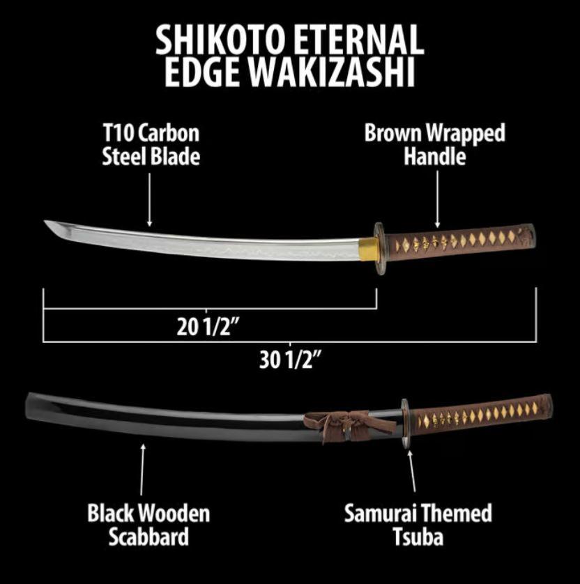 Le Shikoto Eternal Edge Wakizashi est un mélange étonnant de savoir-faire traditionnel et de performance moderne, doté d’une lame en acier au carbone T10 réputée pour sa résistance et sa rétention des bords. Le fourreau en bois, fini avec une laque noire brillante et élégante, améliore l’apparence frappante du wakizashi tout en offrant une protection fiable pour la lame. Ornée d’une tsuba de samouraï finement détaillée, cette épée incarne l’esprit du guerrier, ce qui en fait un must-have pour les collectionneurs et les artistes martiaux. Avec une longueur totale de 30 1/2" ( env. 77 cm ), le Shikoto Eternal Edge Wakizashi offre à la fois élégance et puissance.